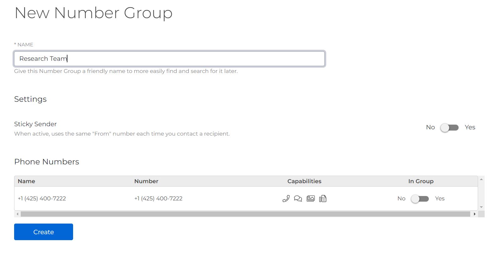 You can create and manage Number Groups in this tab. This is a helpful way to organize your Purchased phone numbers for efficient call handling. Create a new Number Group by clicking the blue "Create a Number Group" or "+ New" button, depending on whether you already have any groups. After you name your group, you can add numbers from your full list of Purchased numbers with a simple toggle. A phone number can be in multiple groups.